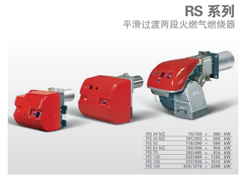 RS系列燃燒器的出力范圍為45~2290kW,適用于中低溫的熱水鍋爐、熱風及蒸汽鍋爐和導熱油爐。